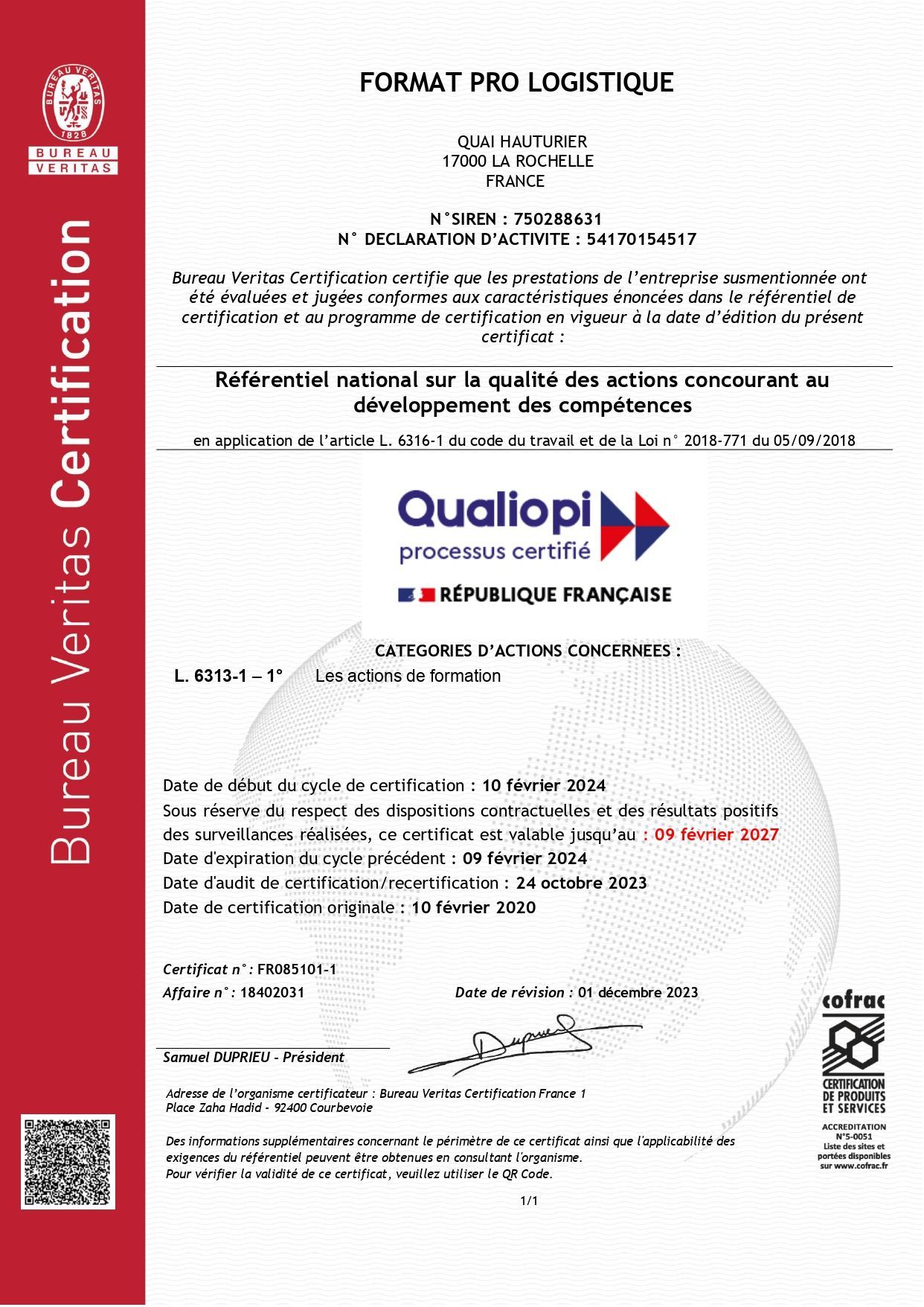 Toute l'équipe de Format Pro Logistique est heureuse de vous annoncer le renouvellement de sa certification QUALIOPI.